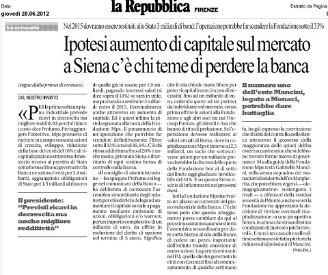 Scusate, sono ignorante, ma se devo credere a quello che leggo, pare che la Fondazione non riesca a seguire l’aumento di capitale (il Giornale) e che sia entusiasta della soluzione trovata (la Repubblica). Se entrambe le notizie sono vere, la situazione è di gran lunga peggio che quel che si percepisce, ma spero che la seconda non sia vera. E la gente continua a stare a guardare. Mah.
