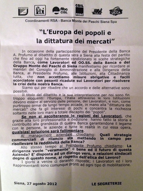 One reply to “La rubrica della DEMOCRAZIA – I sindacati del MPS confinati alla LIZZA… Motivi di ordine pubblico!!!”