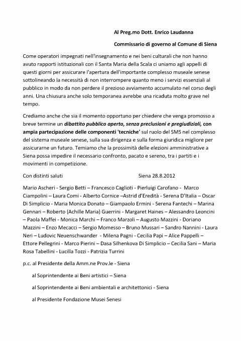 Devo fare una precisazione: il testo รจ cresciuto cammin facendo con le consultazioni degli aderenti e Marco Pierini aveva firmato PRIMA che entrasse l’inciso “senza aver avuto rapporti istituzionali con il SMS”, che come si sa non gli si adatta! D’accordo rimane sul contenuto della richiesta, naturalmente.