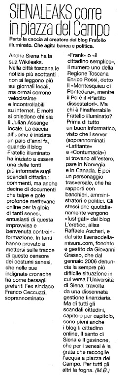 Scusate se è poco almeno un po’ di soddisfazione!! Dopo che passiamo notte e giorno a informarci, montare video, scattare foto, scrivere articoli almeno qualcuno ci cita (per ora non in giudizio!). Oggi avevo già avuto notizia che IL SANTO insieme a tutti i colleghi blogger senesi era stato citato dalla rivista PANORAMA. Ora un amico mi ha inviato l’articolo lo metto con grande soddisfazione, come un atleta che arriva a podio!!! Qualcuno dirà, magra soddisfazione, hanno messo in risalto gli anonimi e i diffamatori(secondo chi non vuol far uscire la verità)!!! Forse però tutte le cose scritte e pubblicate anche se da anonimi, hanno il merito di essere vere!!! Magari la forma lascia un po’ a desiderare, magari, qualche parola si può limitare, magari… Magari un cavolo!!! Senza l’impegno quotidiano, molti senesi non avrebbero aperto gli occhi, molte magagne, scandali e furberie, non sarebbero state evidenziate dai così detti giornalisti iscritti all’albo. Se guardate l’intervista a FRANCO CECCUZZI (che sto’ dipanando pian piano) potete vedere il tipo di stampa che a Siena ha sempre dettato le regole, chiaramente insieme alla politica!! Questo è un gioco che deve finire, come il gioco di dire: “Il passato è passato, bisogna guardare al futuro!!” Noi ci guardiamo al futuro ed è per questo che chi dice bugie, chi è responsabile di aver distrutto Siena in tutte le istituzioni (UNIVERSITA’, MONTE dei PASCHI etc.) Deve essere smascherato e deve chiedere scusa ai senesi, solo così si potrà guardare al futuro, buttando nel GAVINONE il marcio degli anni passati… Saluti a tutti!!! IL SANTO