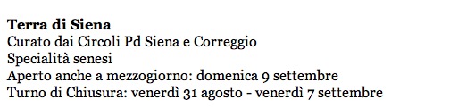 Altra cosa di non poco conto il 18 Settembre 2012 segnalavo al Consorzio per la tutela de Palio una bella iniziativa del PD di Correggio, in collaborazione con i Circoli di Siena, lo stand con le specialità senesi, con tanto di bandiere delle Contrade. Risulterebbe anche che numerosi appartenenti del PD senese abbiano mangiato di fronte allo stand, con tanto di fotografie della Festa democratica, che prontamente dopo la mia denuncia al Consorzio e l’inevitabile diffida sono state cancellate dai profili facebook (colpa mia che non le ho archiviate).