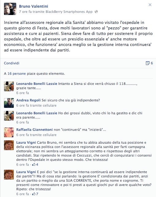 Il democratico candidato a sindaco di Siena Bruno Valentini ha pensato bene di non accettare il confronto sul tema della sua visita alle Scotte insieme all’assessore alla sanità toscana. Egli infatti dopo un mio commento critico al riguardo mi ha tolto l’amicizia e non ha semplicemente risposto alle mie critiche politiche. Di seguito riporto il sunto del mio commento nella sua bacheca riguardo la sua visita all’ospedale: