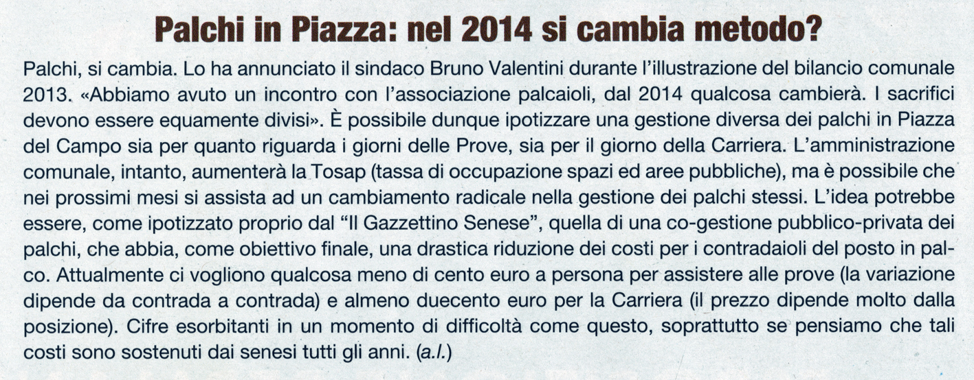 Intanto il Gazzettino Senese ha fatto una pubblicazione di un’indagine assolutamente inesatta e parziale, dimenticando il “contributo volontario” ( che , signori belli , volontario proprio non è!!!!) che ogni palcaiolo deve versare al Magistrato delle Contrade, dimenticando poi i costi di montaggio, smontaggio e stoccaggio dei palchi, e la relativa manutenzione, spesso assurdamente obbligata da una commissione sicurezza sugli spettacoli che fa sganasciare dalle risate, e per composizione e per competenza…quando poi , e basterebbe che il Signor Sindaco si facesse una giratina sotto al palco di palazzo Berlinghieri, potrebbe osservare coi propri occhi quello che viene “non visto” dalla commissione stessa….
