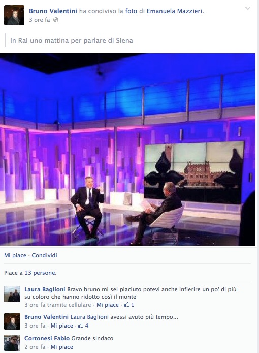Il pianeta rosso è pieno di misteri. E’ sceso però sulla terra un abitante di Marte, il nome di questo extraterrestre è ભુરો વેલેન્ટાઇન ડે tradotto in Italiano corrente è Bruno Valentini. A sentirlo parlare pare un uomo catapultato a Siena per fare il Sindaco con il tele-trasporto. La sua memoria è corta. Con la telepatia riesce anche a farsi credere e tanti boccaloni rimangono stupiti e ammaliati dal suo fiume di parole. Ecco cosa scrive su FACEBOOK (grande fonte di ispirazione per questo blog). Leggete pure cosa dicono i suoi fans. Io gli vorrei domandare una cosa a ભુરો વેલેન્ટાઇન ડે: “Ma su Marte non si era accorto che qui sul pianeta terra qualcuno della sua specie stava facendo dei danni enormi ad una comunità autoctona che aveva creato la sua ricchezza nei secoli?”