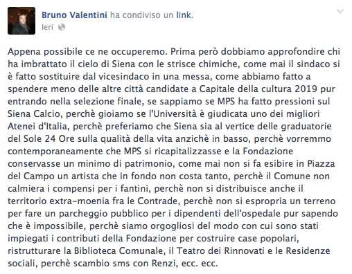 Don Brunetto non smette di stupire IL SANTO. L’uomo che no risponde mai, che sta sempre tra la luce e l’ombra e che voleva fare il RINNOVATORE ora si mette a fare l’ironico e pensa anche di essere simpatico. Non entro nel merito delle interrogazioni presentate dalle opposizioni, certo è che il Sindaco è il Sindaco di tutti, anche dei bischeri!!! Dal mio punto di vista la sua ironia è fuori luogo proprio perché Lui è il Primo cittadino e deve tutelare tutti. Risponda anche alle interrogazioni che ritiene inutili o stupide, ma risponda… Ritengo che Don Brunetto sia un abile depistatore, infatti focalizza l’attenzione di tutti su questioni effimere e non risponde sui grandi temi…