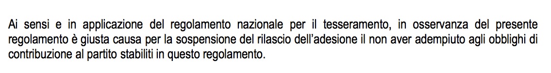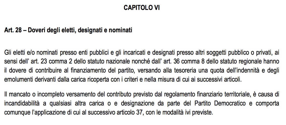 La parte che ci interessa è il capitolo VI articolo 28 del suddetto regolamento (che per praticità ho fedelmente riprodotto nelle foto sottostanti). In quel misero articolo c’è tutto il perché del voto contrario alla diminuzione degli emolumenti alla Fondazione. Capisco bene che il PARTITONE su qualche base si deve pur reggere, ma dico io proprio con i soldini di noi senesi lo devono fare? Difendere un gettone di presenza (alla Fondazione) di 1200,00 euro è semplicemente vergognoso e in questi tempo in cui molti perdono lavoro o sono esternalizzati è semplicemente una follia, ancora più folle perché la difesa viene dal PARTITO DEMOCRATICO, un partito di centro-sinistra!!! Certo venuto meno l’assegno di MUSSARI ora i problemi del partito saranno maggiori, ma che li dobbiamo risolvere noi questi problemi? Mi metto nei panni di un operaio del distretto camperistico, di un infermiere delle Scotte o di un impiegato esternalizzato del MPS, magari con in tasca la tessera del PD e del Sindacato. Sarei altamente incazzato per l’atteggiamento e la sfrontatezza di certi “politici” nostrani dimostrata in Consiglio Comunale!! Come si può offendere così migliaia di persone che in quel partito ci credono e sperano che diventi volano del cambiamento italiano… Spiegatemelo voi, perché io non ci riesco… A proposito se leggete bene è OBBLIGO versare questi quattrini pena la sospensione dal Partito.