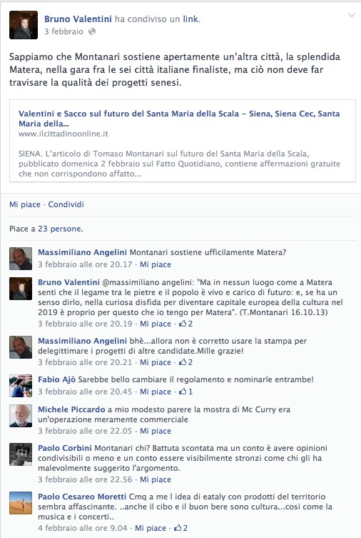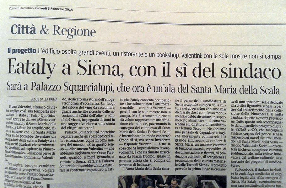 Non conosco il progetto Eatality a cui si riferisce il commento su citato, ma conosco l’azienda Eataly, ovvero un’ottima impresa di Megastore della gastronomia, diciamo un McDonald di ” noialtri ” che porta senza dubbio nelle tasche del Sig. Farinetti molti soldi, visto che e’ un bravissimo imprenditore. Ecco credo che Eataly all’interno del SMS, nella fattispecie a Palazzo Squarcialupi, sia il segnale di un degrado estetico della città, che sia il modo peggiore per usufruire di uno spazio museale riqualificato grazie a 70 milioni di euro di ristrutturazioni con i soldi di Siena e dei Senesi, che gestire la cosa pubblica in trattativa privata non sia LECITO, che aprire uno spazio così grande per la ristorazione danneggerebbe commercialmente tutte le botteghe alimentari (pizzicherie, salumerie, osterie, bar) di cui Siena e’ ricca con conseguenza di perdita di ricchezza sul nostro territorio, ricchezza economica diretta, ricchezza di professionalità, ricchezza di lavoro ( ne apre uno ma ne possono chiudere 100).