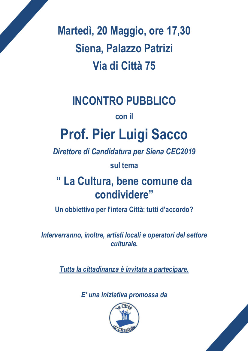Martedì 20 Maggio, ore 17,30, a Palazzo Patrizi, il Prof. Sacco si confronta con i cittadini sul tema: “La Cultura, bene comune da condividere”. L’iniziativa è promossa dall’Ass.“La Città ai Cittadini”, da anni impegnata a diffondere la ‘cultura’ della partecipazione democratica, dell’impegno civile e promotrice di esperienze di cittadinanza attiva. E’ convinzione radicata dell’associazione, infatti, credere che informare correttamente i cittadini e renderli partecipi delle scelte strategiche che coinvolgono la collettività sia utile a esercitare quel monitoraggio del dibattito democratico, teso al rispetto dei beni comuni e dei principi fondamentali di libertà, uguaglianza e partecipazione alla vita pubblica. L’incontro con Sacco si presenta dunque come un’occasione di confronto aperto per chiunque intende dare il suo contributo per concorrere coralmente alla corsa per far diventare Siena Capitale della Cultura Europea.