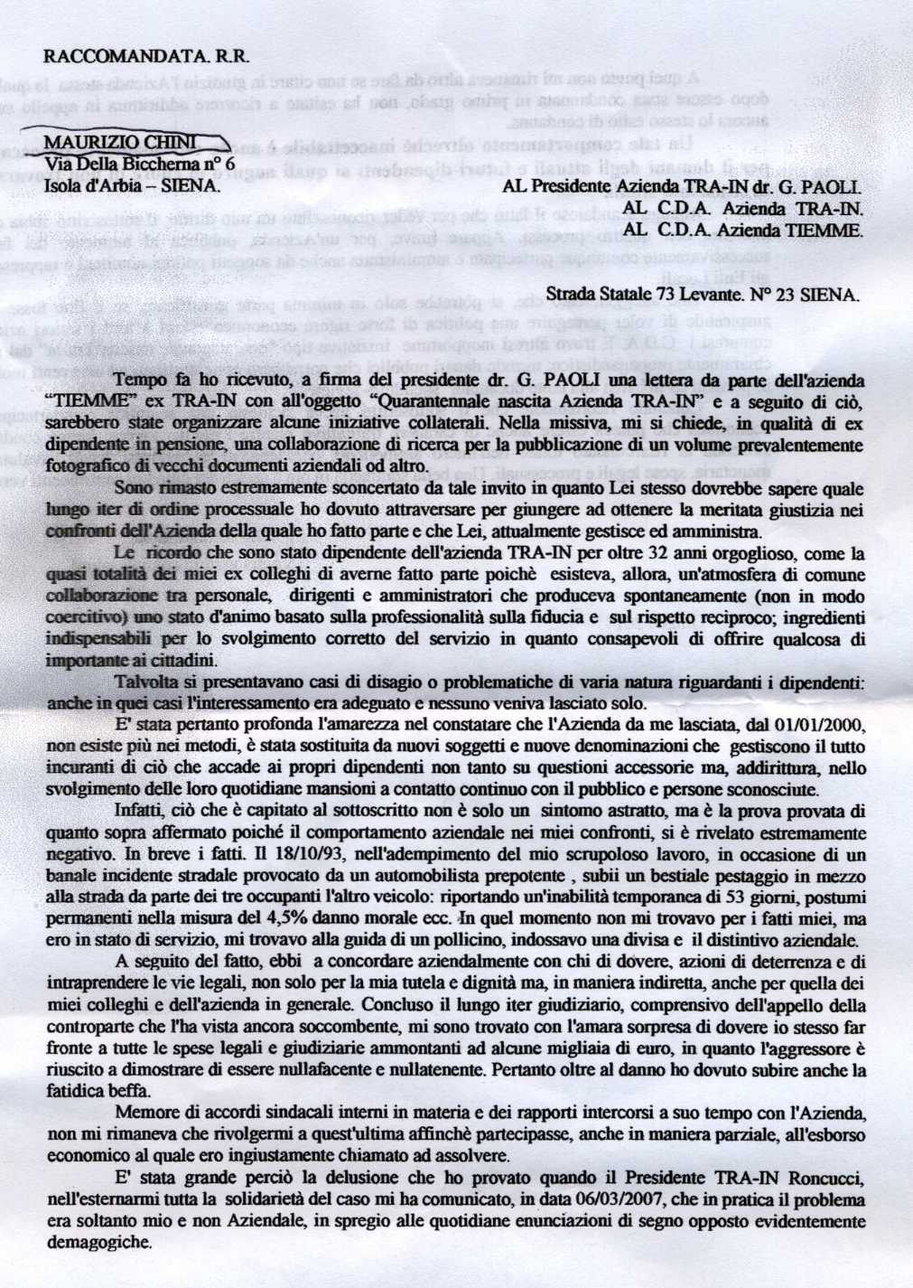 Il lavoro una volta si diceva che “nobilitava l’uomo”. Era la frase che i miei nonni e i miei genitori mi dicevano spiegandomi che la fatica di un lavoratore, intendendo non solo l’ operaio ma anche lo spazzino- l’avvocato-l’industriale e così via, se lo faceva onestamente e seriamente con impegno sarebbe stato gratificante. Insomma un lavoratore sarebbe stato un “sangue blu” della sua attività, facendo del guadagno economico solo un’ indispensabile valore numerico da usare per la propria vita da usare per la famiglia, viaggi, cultura,divertimento a seconda del proprio interesse. Tutto questo era tenuto in un certo equilibrio dal senso di giustizia che tra gli anni ’50 e ’70 aveva fatto sorgere un’ etica del lavoro con il riconoscimento dei sindacati e della indipendenza degli organi di giustizia che in qualche modo calmieravano le reazioni violente di chi non voleva essere più schiavo . Successivamente tra gli anni ’70 e ’90 si è voluto a tutti i costi fare i finanzieri portando anche chi non sapeva cosa era la finanza ad investire i soldi guadagnati per soddisfare non solo le proprie necessità ordinarie ma rifacendosi al modello dei protagonisti di “Dallas”. Tra gli anni ’90 e oggi tutte le attività produttive sono state gestite da persone che non avevano scrupoli. Questi hanno fatto in modo che i numeri fossero sempre più grandi ed li hanno usati non per “nobilitare il lavoro dei singoli lavoratori”, ma semplicemente per far apparire i propri prodotti più belli e più finanziariamente interessanti. Insomma l’ era dell’ apparire al posto di quella di essere. Credo che se il signor Chini fosse stato un’ azionista con il 70% della società avrebbe avuto la solidarietà di tutte le parti sociali del territorio, tutti gli articoli dei giornali, l’ invito a tutte le trasmissioni radiotelevisive e chissà forse poteva anche ottenere una parte in qualche serial americano, senza dimenticare che i migliori avvocati lo avrebbero difeso gratuitamente……..invece è un semplice lavoratore che crede, almeno così sembra nella lettera, che :”il lavoro nobilita l’ uomo”. Credo che negli ultimi tempi, la regola è : “meno lavori bene e meno rispetti il tuo lavoro e più potrai guadagnare (per chi interessa!!)” Per il resto i sindacati sono come molte associazioni culturali-sportive e altro, cioè delle società dove puoi solo sperare di trovare delle persone “normali” e forse certe cose non ti succederanno. Insomma ogni mattina tiriamo la monetina per aria e speriamo che ” un piova…….”
