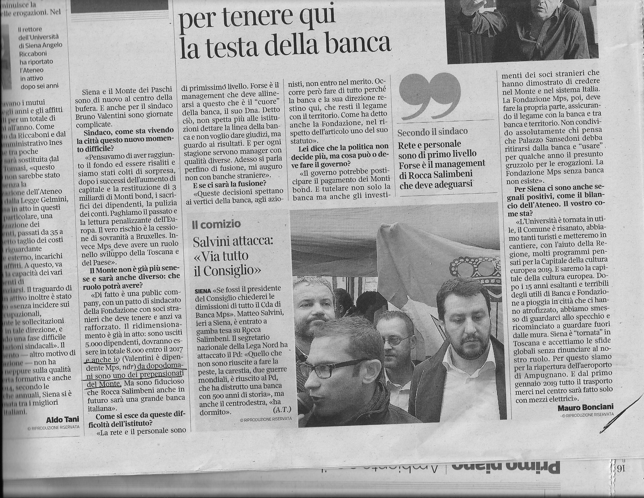 Veramente il nostro Sindaco non finisce di stupirci. In questo momento drammatico per Siena l’unica cosa che riesce a fare è inondarci di parole!!! Lo troviamo praticamente in ogni dove, su internet lo potete trovare su repubblica (clicca e leggi) ma anche nelle agenzie, su radio 24 (clicca e ascolta). Ma c’è da capirlo, infatti, come ha detto in un’intervista del Corriere Fiorentino del 30 Ottobre ci dice che dal 1 di Novembre sarà uno dei prepensionati del Monte!!! Caspita dico io e ora chi lo tiene? Uno abituato a stare in ufficio come Lui avrà dei problemi a riempirsi la giornata!!! Ancora non può portare i nipotini alla Lizza a vedere i cigni, il Guiccia non lo ha ancora fatto nonno! E allora cari senesi lo vedremo ancora più spesso in televisione e sui giornali… Disdetta, maledetta disdetta!!! Certo avrà più tempo per studiare qualcosina in più sul palio, magari studierà che la campanina non è la campanella e che i cavalli davanti hanno la testa e dietro la coda… Vorrei fare una proposta alle testate locali, sia quelle tradizionali che quelle on line, magari potete dedicargli uno spazio in cui possa esprimersi, che ne so per esempio: La Rubrica di Bruno Valentini… Come spararle grosse e continuare a fare il Sindaco!!! Oppure L’Oroscopo di Bruno… Previsioni certe fino al 2019 poi so’ cazzi vostri tanto io sarò in pensione!!! Infatti tutte le volte che viene intervistato si riferisce al 2019 anche sul Corriere Fiorentino di oggi ci dice che tutte le consegne nel centro storico dal 1 Gennaio 2019 saranno fatte con mezzi elettrici, pare che dal 2 Luglio 2019 i cavalli del palio saranno geneticamente modificati e non faranno la cacca per non sporcare!!! Dal 2019 poi il Sindaco di Siena sarà virtuale le prove sono iniziate lo scorso anno… A proposito il buon Valentini sempre nella stessa intervista ci dice che riaprirà lo scalo di Ampugnano, vuoi vedere che l’apertura è prevista per il 2019?