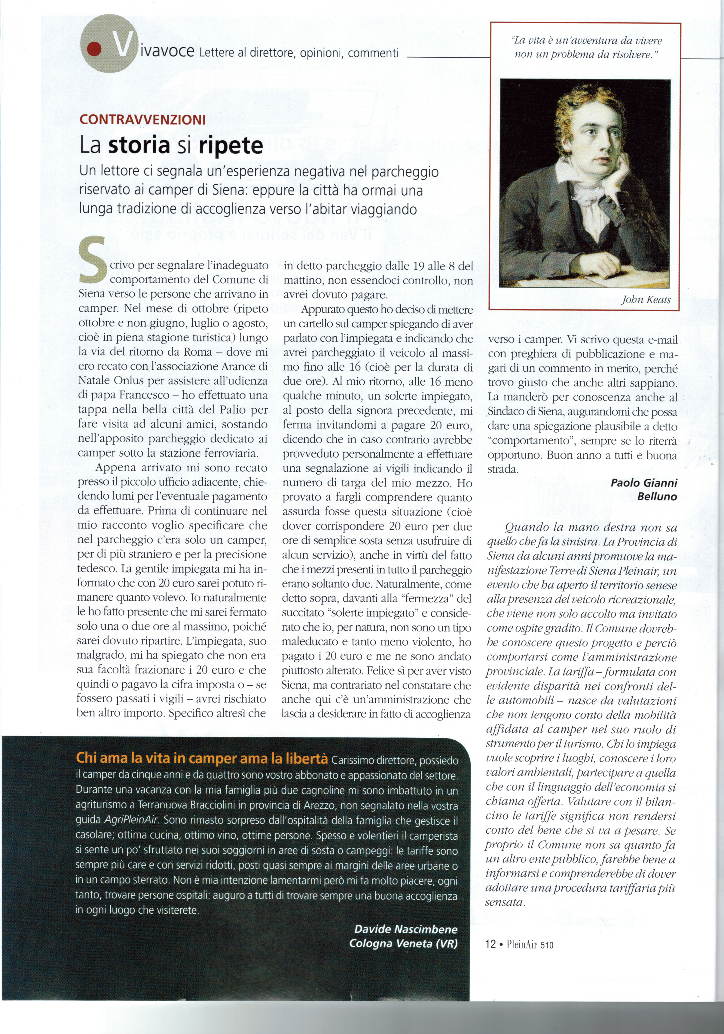Parlando come ormai accade da tempo della situazione locale, mi sono imbattuto in questa lettera sul mensile Plein Air, rivista che si occupa di turismo con veicoli ricreazionali…i camper.