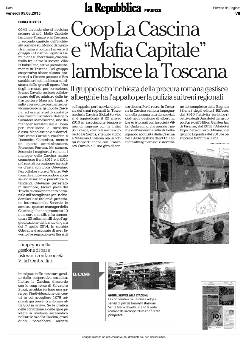 Lo scandalo MAFIA CAPITALE tocca anche siena con la COOPERATIVA LA CASCINA. Non c’è pace per il nostro territorio. C’è da domandarsi, chi sono i referenti senesi della Cascina? Saranno mica gli stessi che hanno affondato il Monte dei Paschi? Ci sono delle intercettazioni molto interessanti su LA CASCINA, si parla di mazzette… Vedremo.