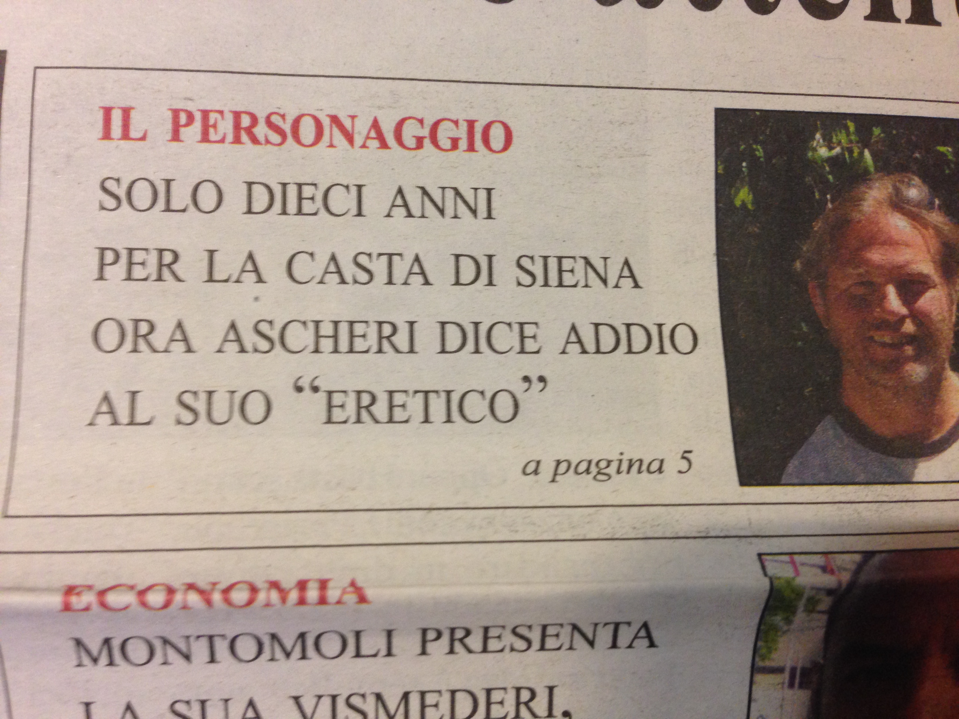 Oggi al bar mi è capitata tra le mani la copia di Luglio di #SIENA ho notato in prima pagina un volto conosciuto: quello de L’Eretico. Il titolo mi da un po’ di tristezza, ma io ero già a conoscenza della decisione di Raffaele di lasciare il suo blog. Un blog che ho visto nascere, durante i primi vagiti ero presente, con una tastiera a cui mancavano tre o quattro tasti nello studio del professore affogato dai libri con in mano un’ottima tazza di The.