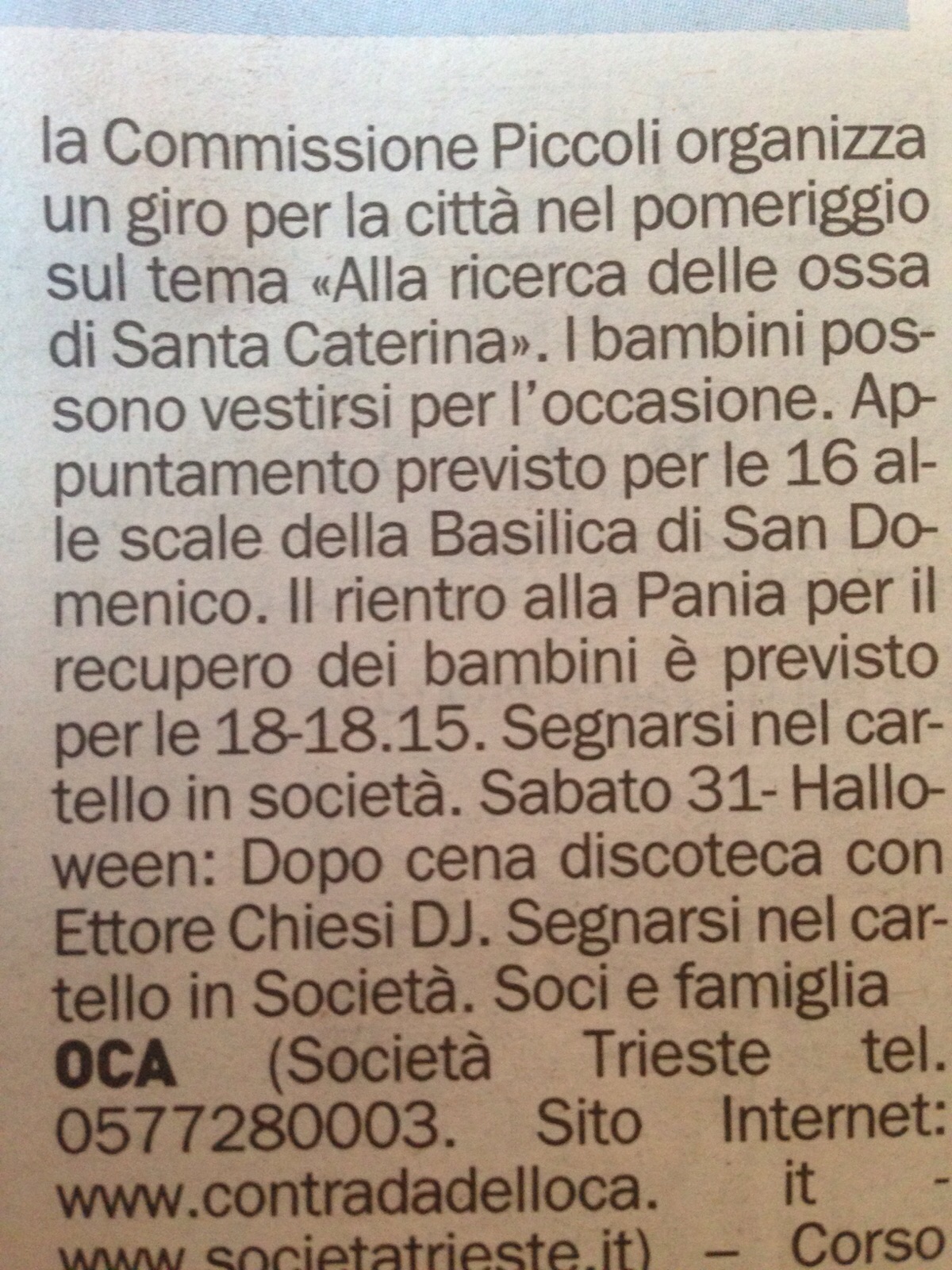 Sabato prossimo sarà la festa di Halloween, una festa che è arrivata da noi in questi ultimi anni. Una Contrada ha organizzato (legittimamente) per Halloween un giro in città per i bambini dal nome “Alla ricerca delle ossa di Santa Caterina”, con la possibilità di vestirsi per l’occasione. La prima domanda che mi sorge è: “Ma che ci incastra Santa Caterina con Halloween?”
