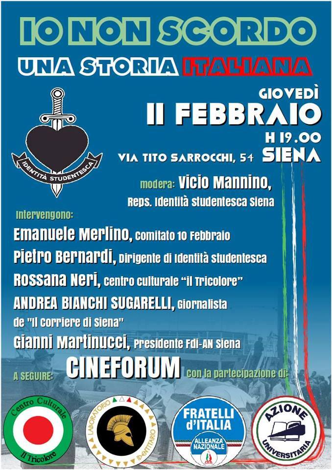 In Occasione della “Giornata del ricordo” Identità Studentesca Siena ha organizzato, in data 11 Febbraio, un convegno per ricordare le Migliaia di Italiani barbaramente uccisi e massacrati ad opera delle truppe del generale comunista Tito.