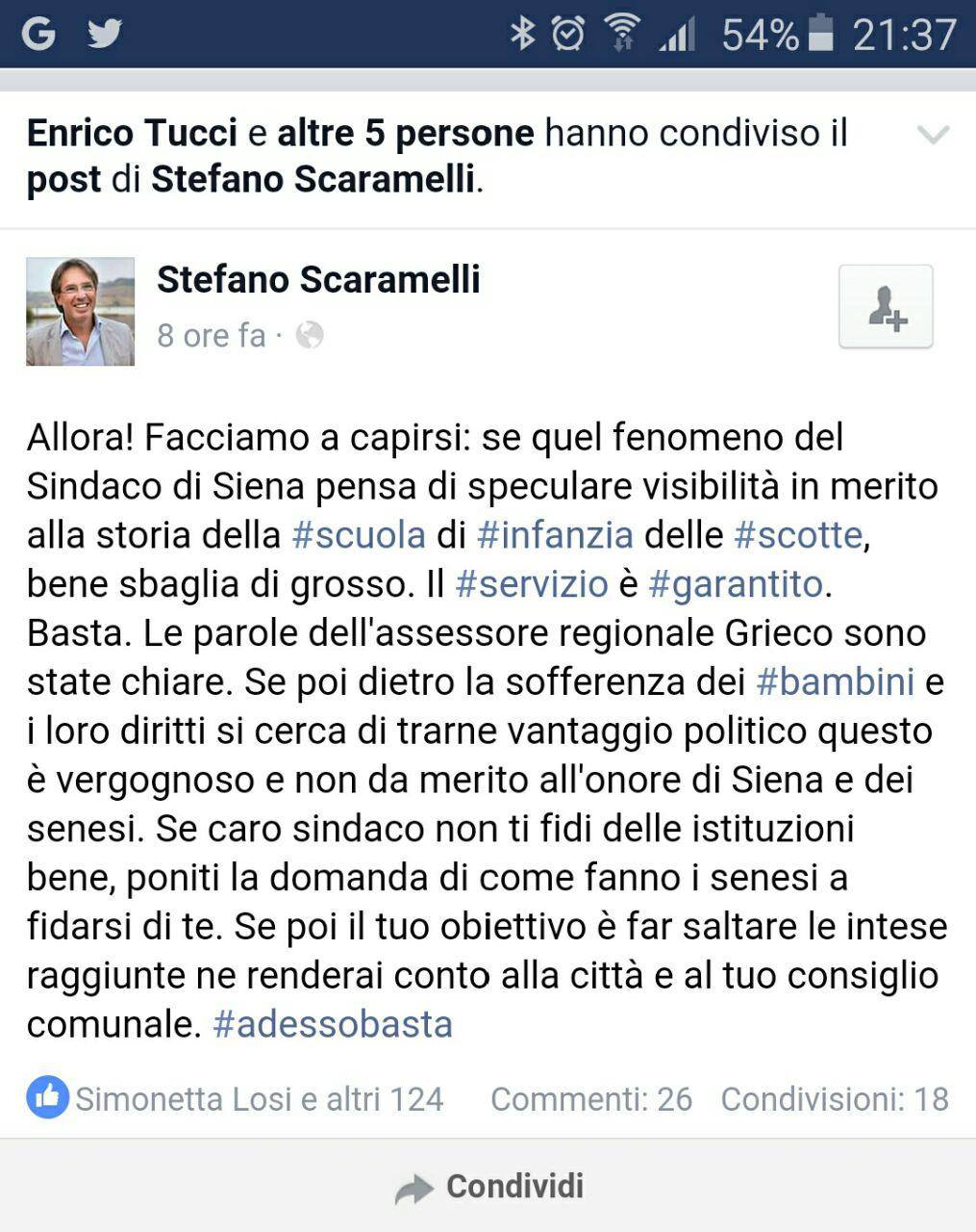 E’ incredibile che due politici dello stesso partito, usino facebook come un adolescente per scannarsi a vicenda. Sarebbe credo più opportuno farlo nelle sedi dovute e visto che lo SKARAMELLI ha la possibilità in Consiglio Comunale, stacchi la spina a questo Sindaco che non gli piace e si prenda le proprie responsabilità.