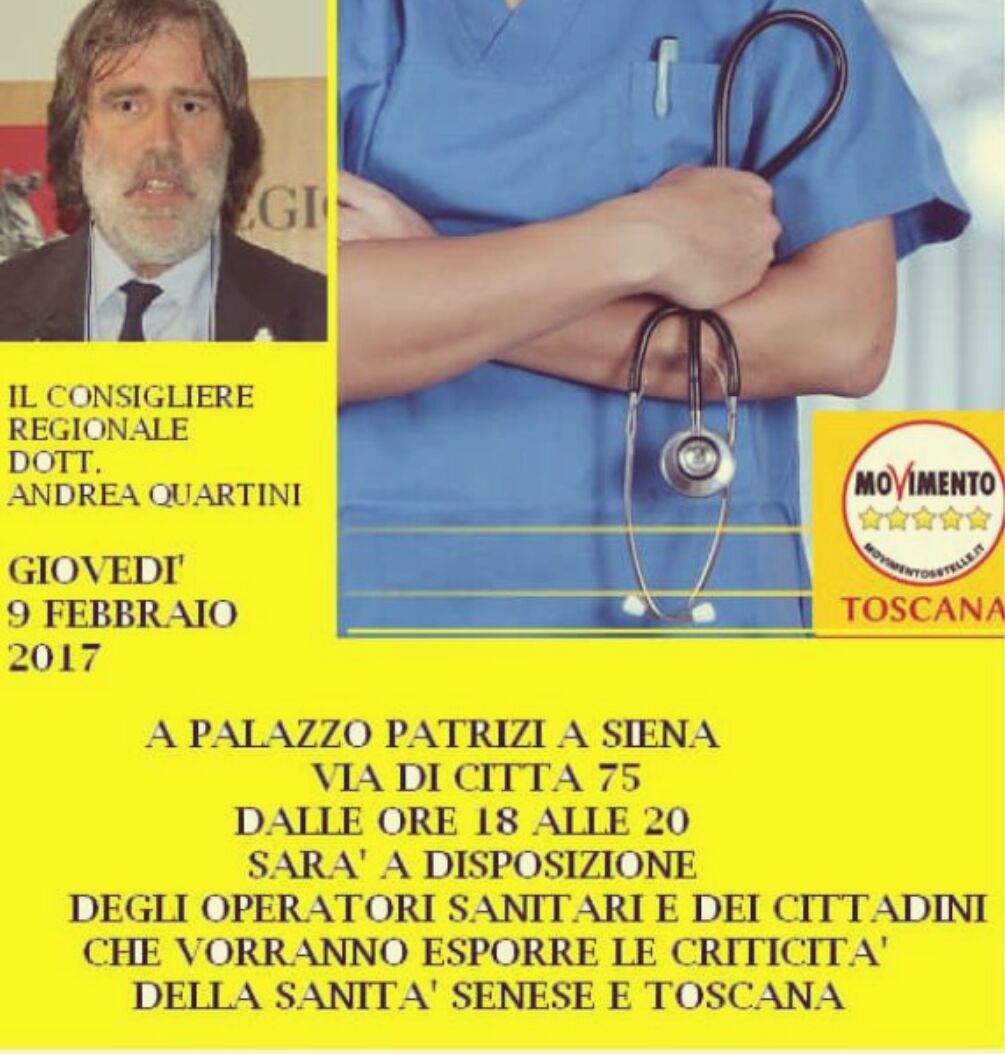 Alfonso Coletta medico ospedaliero in pensione ma sempre attivo come medico invito tutta la cittadinanza, simpatizzanti, antipatizzanti del M5S all’incontro col dr. Andrea Quartini,Consigliere Regionale M5S, anche lui medico che sarà ben lieto di ascoltare le eventuali criticità dell’ospedale Le Scotte e della sanità senese