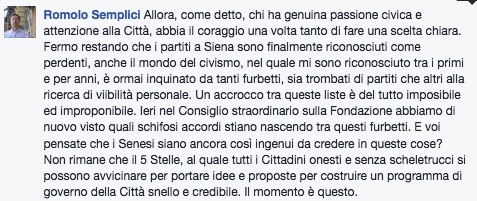 Il Dado è tratto, c’è la conferma ufficiale, Romolo Semplici ormai è con tutti e due i piedi dentro il Movimento 5 Stelle senese.