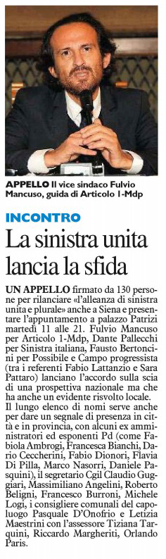 Caro Federico, non voglio certo passare per uno che si nega ad un confronto, purchè il campo (sia chiaro!) sia sgombro da pre- giudizi e strumentalizzazioni. Del resto, davvero, non posso immaginarmi a chi mai può interesserare se, il sottoscritto, ha firmato un manifesto di valori insieme ad altre 130 persone: ho ritenuto quell’iniziativa utile a riaffermare una serie di principi che nella nostra società vannno affievolendolsi e presidiarne la loro esistenza e la loro rappresentanza. Inutile ripeterti che agisco sempre da semplice cittadino e non ho alcuna velleità se non quella di essere libero di esprimere le mie opinioni, con naturalezza e spontaneità. Mi rendo ben conto che basterebbe fare come le note scimmiette (‘non vedo’, ‘non sento’, ‘non parlo’) per vivere ‘tranquilli’. Tuttavia, proprio per la mia convinzione dell’importanza di una consapevolezza di ‘cittadinanza attiva e partecipe’ (che ben fai a ricordare…) non è raro che mi trovi coinvolto (convintamente) in battaglie di impegno civico e civile, non aspettando che altri combattano per me per una società più rispondente ai miei valori di riferimento. E’ per questo che mi sono avvicinato alle esperienze delle Liste Civiche (maggio 2010), esattamente nell’area di Libera Siena (la stessa per intenderci di Romolo Semplici), successivamente ho appoggiato la candidatura di Gabriele Corradi nel 2011 (persona che conosco fin da bambino e a cui mi sento legato da naturale simpatia e stima), nonchè, assieme agli amici di Pietraserena, ho contribuito ad alcune iniziative sulla libertà di stampa (anzi se non ricordo male le prime tue uscite pubbliche come blogger risalgono proprio a quegli eventi), sui temi di Banca e Fondazione e altro…, convinto sempre della bontà di impegnarsi per riaffermare principi e istanze che non vedevo sufficientemente difesi. Proprio per questo, mi piace qui ricordare, di essere stato uno dei pochissimi (qualcuno sui giornali il giorno dopo parlò di ‘quattro gatti’) a partecipare ad una primissima manifestazione in p.zza Tolomei, sulla ‘Libertà di stampa’, promossa da Raffaele Ascheri, in cui erano presenti oltre al sottoscritto, Mario Ascheri, la presidente dell’allora costituito Comitato No Aeroporto di Ampugnano, Avv. Mariani, il già citato Romolo Semplici e l’allora consigliere (di maggioranza!) di Rinfondazione Comunista Francesco Andreini. Le idee – lo confermo – uniscono. Come un’idea è quella di credere in una Città innovativa, solidale, inclusiva, capace di pensare ad un modello di sviluppo in linea con i programmi europei e con quanto avviene nelle città più avanzate del vecchio continente. Confrontandoci su queste tematiche ho imparato a conoscere Fulvio Mancuso, accorgendomi da subito di condividerne alcuni valori di riferimento. E sono appunto i valori, le idee in cui si crede, certe sensibilità a tematiche specifiche, a unire ed avvicinare le persone. Tutto qua, con estrema semplicità. In tutta onestà, poi, ti dico che devo seguire la mia quotidianità con un certo impegno e mi è difficile star dietro a tutto. Sono e rimango un cittadino di questa città: la mia unica aspirazione è quella di esprimere, se voglio, la mia opinione in piena libertà, facendolo con il mio metro di giudizio e la mia capacità di analisi critica e discernimento. Insieme a pochi altri ho cercato di aprire squarci di dibattito democratico (Osservatorio Civico, poi Laboratorio Civico), ricercando sempre un confronto costruttivo, che fosse utile a capire meglio e di più le dinamiche cittadine. Non dimentico nulla di cosa è stata questa Città nei quindici/venti anni passati e credo anche, in tutta onestà, e secondo i miei modesti mezzi, di aver cercato una sorta di reazione, quella che per esempio ispirò anche la marcia del Febbraio 2013 (la prima avvenuta a Siena, dopo quella ‘epica’ organizzata dal Comitato NO Ampugnano, anni prima). Nè trascuro di considerare il coraggio di chi si è costruito nel web spazi di libertà. Ti ripeto, fin quando sono le idee e i principi ad avere la preminenza, tutto si supera, anche certe incomprensioni di vedute. Quando entrano in campo interessi e secondi fini (cioè, fini non dichiarati e privati), allora tutto si complica e più difficile è dare spiegazioni. Fino ad adesso questo per me non è mai stato un problema.