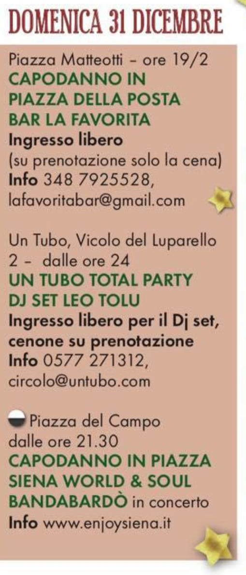Nella miriade di eventi che sono proposti, vi devo dire che mi sono un po’ perso, ma l’occhio mi è caduto su alcuni eventi che vengono promossi da ENJOY SIENA e dal Comune, che vengono realizzati in spazi e locali privati. Mi sono domandato se a Siena esiste solo LA FAVORITA oppure UN TUBO (per esempio), perché la solerte amministrazione pubblicizza eventi in questi due locali? Saranno sponsor del Comune? Se così è, ci sarà stata un’informativa che ha coinvolto anche altri locali e solo questi due hanno risposto positivamente? Mah! Magari qualcuno mi potrà rispondere anche perché mi pare una bella pubblicità in tempi di magra come questi.