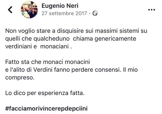 Nei mesi che si succedono il Neri scrive vari post, incontra persone e esterna le proprie considerazioni su Facebook sotto una chicca. Il De mossi non va bene perché ha i partiti dietro, Pierluigi Piccini non lo digerisce e non gliele manda a dire, lo Sportelli ora va bene anche se ha in squadra il Marzucchi (la cui storia politica è nota) e il Monaci, uomo ombra da sempre! Cosa è cambiato Settembre ad ora, forse le stagioni? Il meteo può essere un problema!